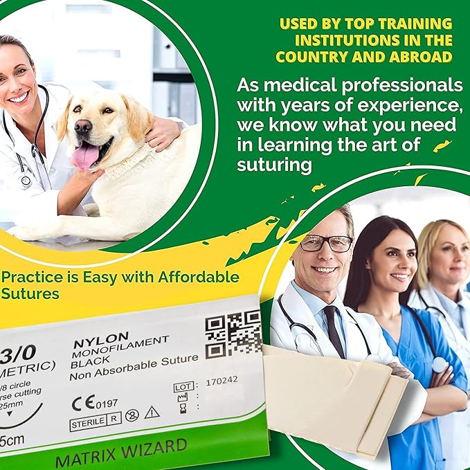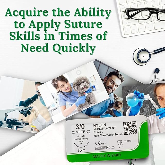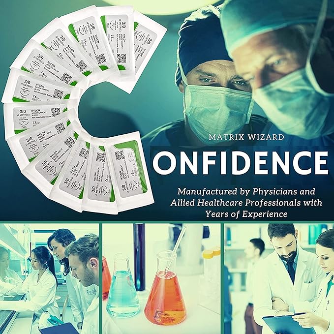 3-0 Sterile Sutures Thread with Needle (Black Monofilament) - Medical and Nursing Student's Surgical Practice Suture Kit, Training with Stitching Pad, First Aid Field Emergency Demo, Vet Use