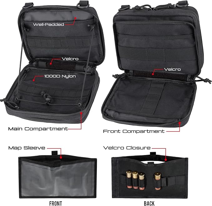 - PREMIUM NYLON & ZIPPER: Tactical pouch is made of 1000D nylon for sturdily, tear-resistance and water-resistance. Molle pouches has a sturdy and smooth double zip that opens quickly and lays flat for easy access to tools or tactical gear. Thanks to the good closure of the zip, the inside of the bag can be kept dry and protected from moisture and sand.Tactical Pouch will be perfect for your field day or everyday activities. Dimensions: 9.5"L x 7.5"H x 3.2"D / 24*19*9cm(L*H*D).