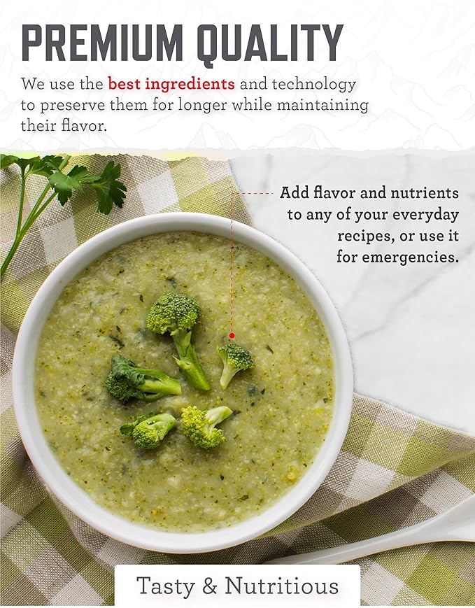 - FUTURE-READY: Our dehydrated vegetables bucket offers up to 25 years of shelf life, ensuring your emergency supply stays fresh. Plus, its stackable design fits conveniently in your pantry, car, or backpack, making it ideal for long term food storage.