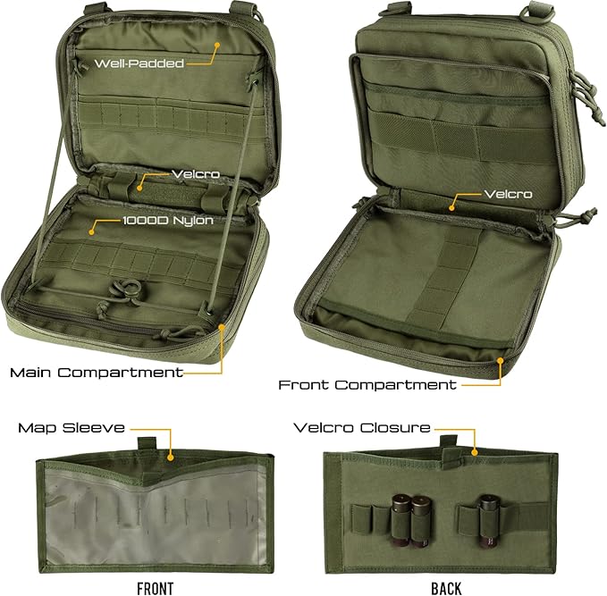- Functional Ultimate Organization: Tactical molle pouch has two fully open main compartments. The front compartment constructs with multiple pockets to store your EDC tool. Admin Pouch with a removable 7 inches x 10.5 inches vinyl sleeve is for maps or documents. Molle pouch's horizontal elastic loops allow you easily to take and store tactical EDC pens, torches, and other stick tools. The rear compartment of our molle pouches has the same organizational space