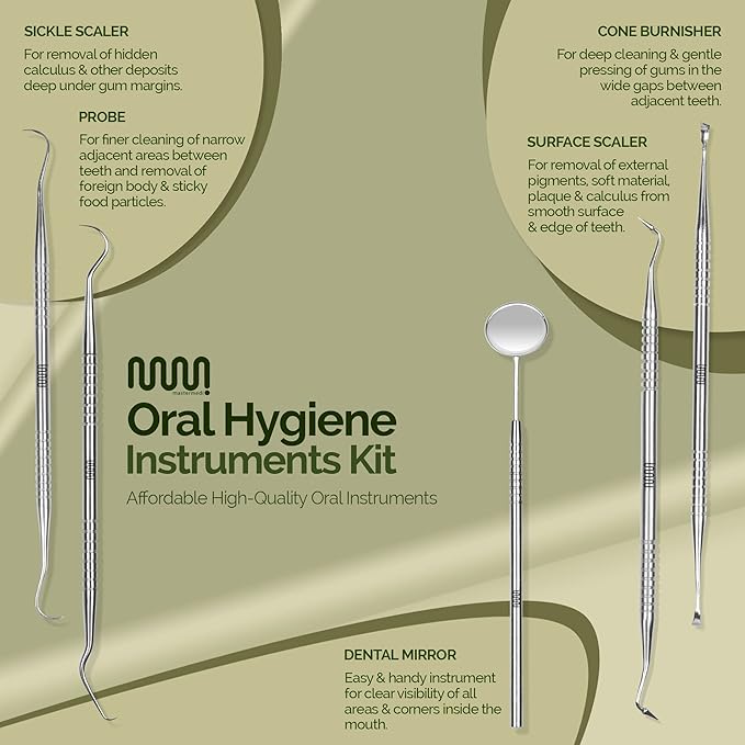 - SURGICAL GRADE DENTAL CLEANING KIT FOR AT-HOME CLEANING: Designed for utmost value, the professional pack includes 1 mouth mirror, 1 dental scaler, 1 sickle scaler, 1 tongue scraper, 1 cone burnisher and 1 probe. Suitable for dentists, hygienists and personal use, this equipment kit is a must-have for all. It also helps in keeping teeth healthy between dental visits