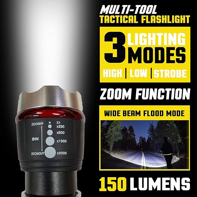 - This tactical multitool flashlight has a brightness of 300 lumens. Its built-in zoom option features both high and low brightness settings and a strobe setting in case of emergency, powered by 3x AAA batteries - Included!