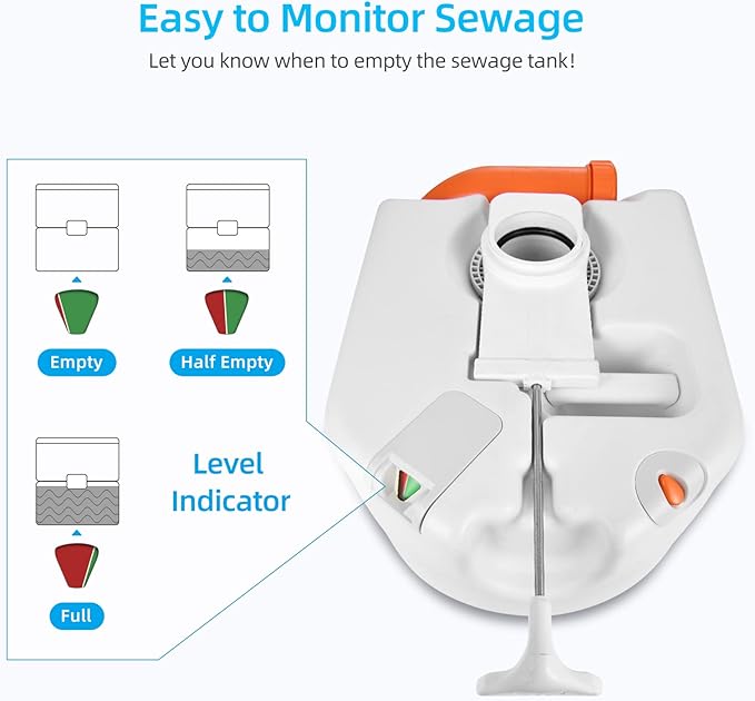 - LARGE CAPACITY & LEVEL INDICATOR: The portable travel toilet has a 4.5 gallon (17L) freshwater tank (There is also an external connection pipe design) and 6.3 gallon (24L) waste-water holding tank, which ensures the portable toilet for camping can be used for multiple times; The level indicator design let you know when it's time to empty the waste water tank, more convenient for you