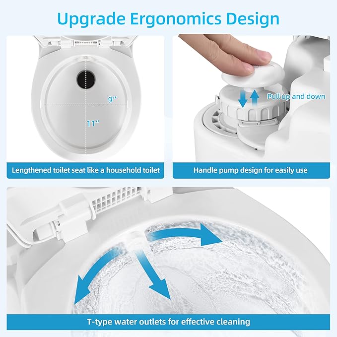 - T-TYPE WATER OUTLETS & HANDLE FLUSH PUMP: The RV toilet is T-type water outlets, which is more dispersed and more effectively and comprehensively cleans the stains on the dead corners; And the handle pump design allows you to operate more effortlessly to pressurize and flush the toilet