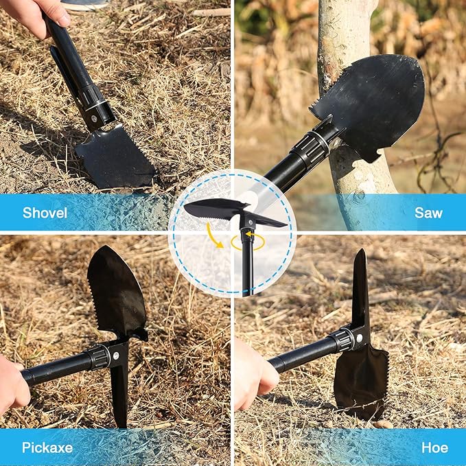 - FOLDABLE SURVIVAL SHOVEL: At 16.5 inches, it's a portable size and comes with a carrying pouch. Its versatile design allows for shoveling, digging, hoeing, sawing, and chopping, making it the perfect tool to get you out of any tight situation.