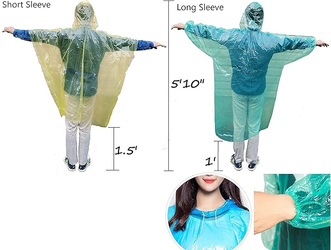 - [Disposable Ponchos Adult Clear Rain Poncho] Pick the disposable raincoat you need. Each adult rain poncho is plastic rain poncho. Our disposable ponchos family pack is also called: emergency rain poncho, emergency ponchos with hood, adult ponchos for rain, family ponchos, plastic poncho.