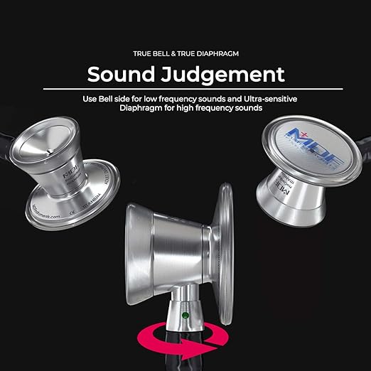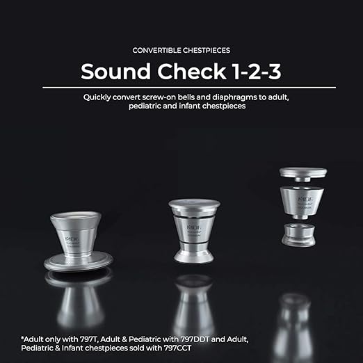 - CHESTPIECE: cardiology grade dual head stethoscope for adult diagnostics that delivers transmission of heart, lung, stomach (GI, bowel, etc.) & blood pressure flow (Korotkoff) sounds with acoustic integrity & clarity for doctors, nurses, students in clinical or home settings. TRUE BELL & DIAPHRAGM: designed with a turnable fully rotating stem for diaphragm & bell side to capture high or low frequency sounds as needed. CONVERTIBLE full pediatric & infant-neonatal chestpiece (sold separately).