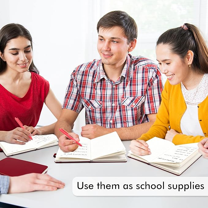- Feela 12 Pack Classic Ruled Notebooks contains 12 classic wine ruled sturdy cover notebooks and 12 Black Retractable Pens. Each of the notebooks measures 8.3” x 5.1”, which is perfect to carry and easily held by young girls and boys. These black cute pens are customized to be placed in the pen holder, which is pretty convenient.