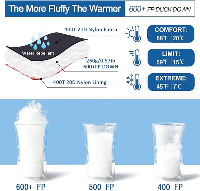 - γ ππππ ππππ γThe camping sleeping bag is filled with 9.2oz selected duck down with 600 Fill Power, suitable for warm weather. Pure natural and healthy material, fluffy and soft, no odor or impurities. The sleeping bag specially adds a 1.6 " cloth strips for wind protection. Comfortable Temperature:59Β°F-68Β°F, Limited Temperature: 45Β°F, your great choice for summer sleeping bag!