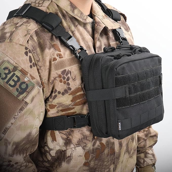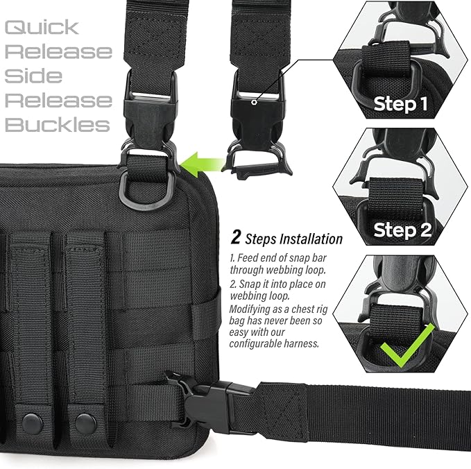 - EASY TO ATTACH: Tactical Suspender adopt the snap bar buckle and just run it through the top D-ring webbing loop, and the rear Molle webbing of your tactical admin pouch/chest bag, then deadly snap into place or side-release to take off, easy to fits 1"/25mm webbing and standard Molle webbing.