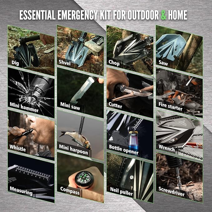 - 🔥Multifunctional survival tool:🔥 The camping shovel surface is designed with saw, nail puller, scale, wire cutter, wrench, chopper. The handle includes bottle opener, mini harpoon, screwdriver, fire starter, whistle, mini hammer, compass. Very suitable for chopping, shoveling, cutting, sawing, digging, hammering.