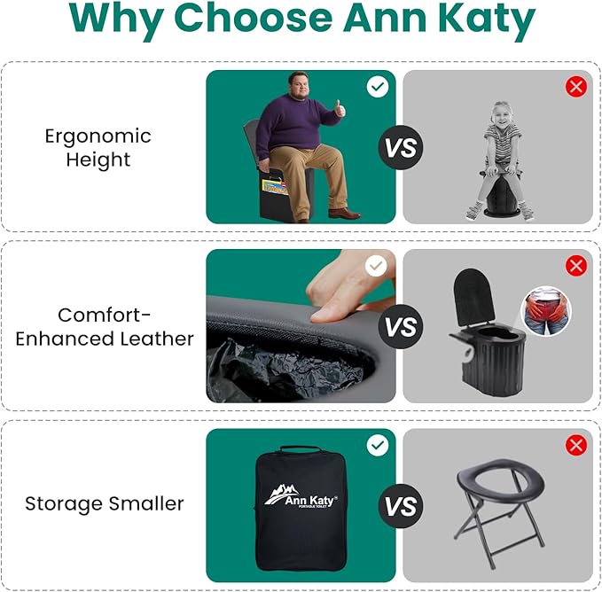 - 【Ergonomic Design】The upgraded Ann Katy toilet has a height of 15.7 inches, a size we developed after extensive research and professional approval. This height helps fully relax the muscle, allowing the colon to empty quickly and completely. It’s also the perfect camping toilet on the market with the right height!