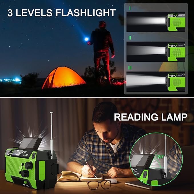 - 【3 MODES FLASHLIGHT & 6 LED READING LIGHTS】 If you encounter a power outage or at night, this emergency crank radio can be used as an emergency light source when you need it. With 3 brightness modes ( low-mid-high)and 6 LED reading lights, this flashlight radio is enough to meet your different brightness needs and keep you and your loved ones out of the dark in an emergency situation. Also, The SOS alarm is loud enough to catch others' attention to ask for help while you're in trouble.