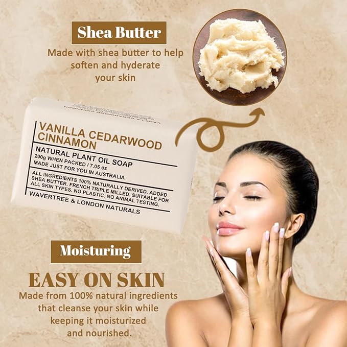 Wavertree & London Vanilla Cedarwood Scented Natural Soap Bars (2 Bars), 7oz Moisturizing French Triple Milled Soap enriched with shea butter - Plant Oil Bath & Body Soap Bars [100% Naturally derived]