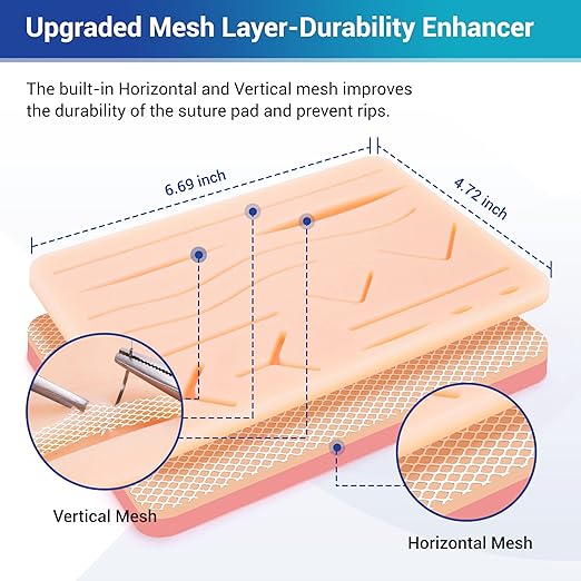 - DURABLE AND HIGH QUALITY -- The durable, reusable, and high-quality suture pad is designed to replicate the anatomical structure of human tissue. It provides three layers to provide the best human tissue simulation possible: Skin, Fat, and Muscle. The suture pad also features an improved built-in "mesh layer" between the skin and the fat layers. This feature improves the durability of the suture training pad and prevents rips of the skin layer for the most realistic simulation.