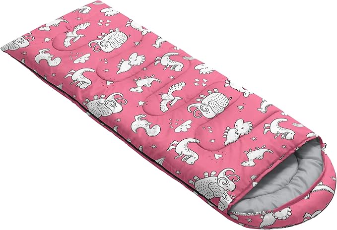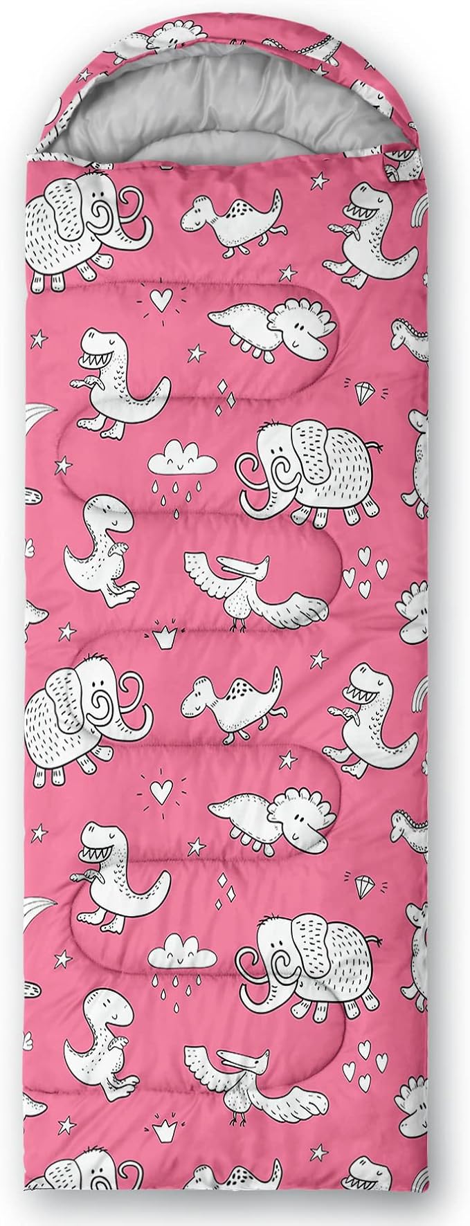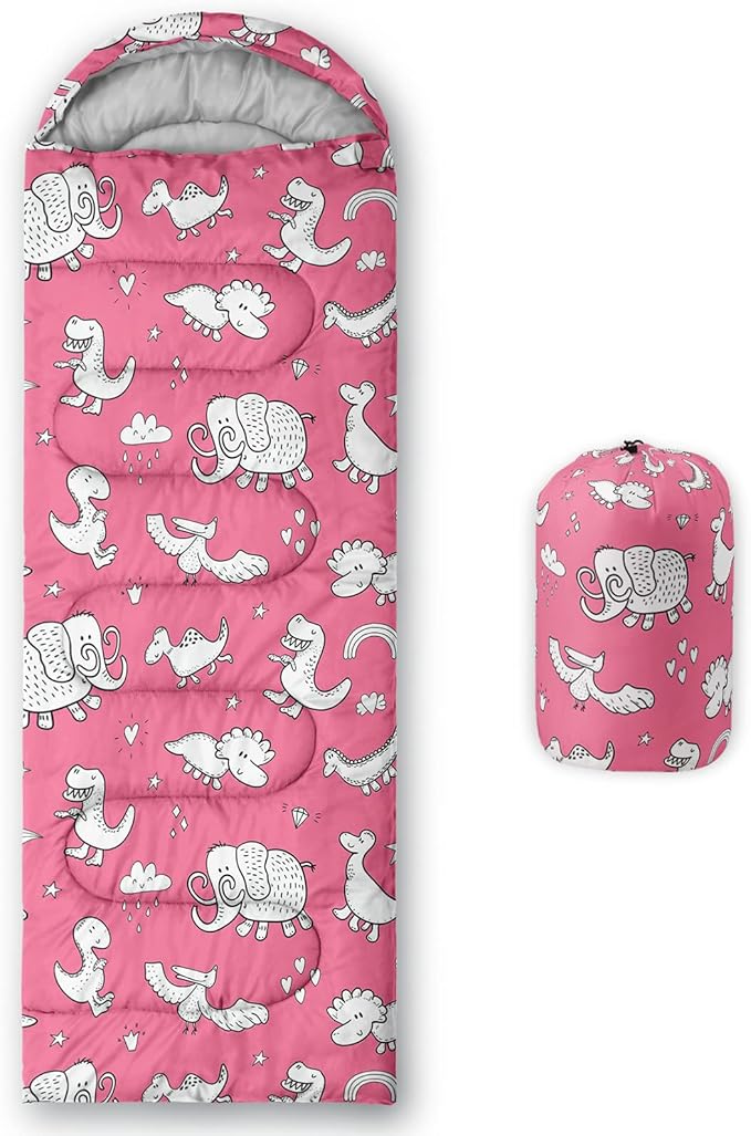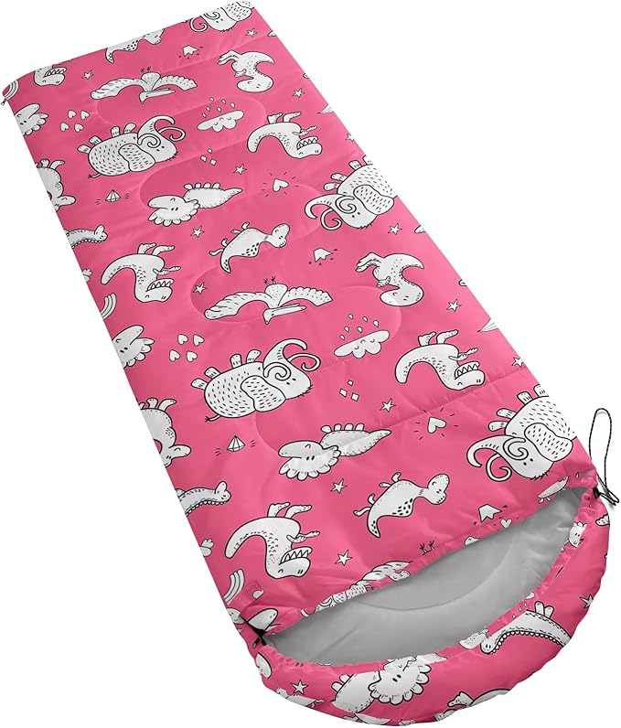- A THOUGHT OUT DESIGN: Drawstring allows you to tighten hood and keep you warm. The idea of having a zipper at the foot to allow more warm or cool air to enter or exit the bag in different times of the season.Our Pink Dinosaur sleeping bags are designed to provide much needed rest after a full day of outdoor activities.