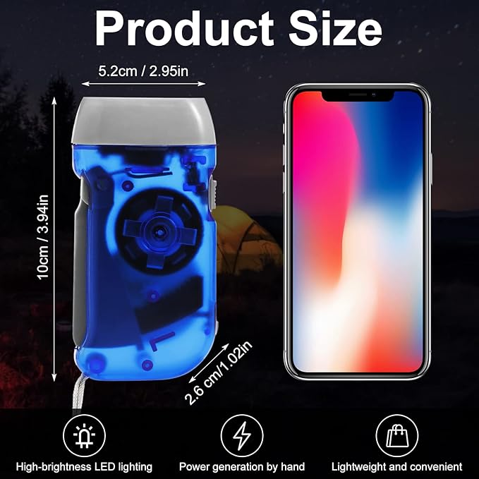 - No Battery Required: with the built in micro power generation device, you only need to squeeze the handle of the manual powered flashlight a few times with one hand, which can generate electricity automatically, it is energy saving so that you do not need to buy batteries