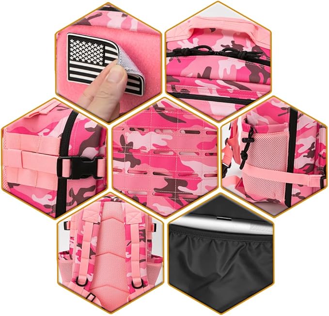 - 【MOLLE MODULAR DESIGN】 The Laser Cut Molle Webbing Design making this tactical backpack special. it uses Two Layers Fabric Laser Cutting MOLLE Hang System to allow all range of tactical pouches attachment., designed to be used in combination with other equipment, you can attaching extra pouches or gears as tactical backpack; such as kettle pouch, walkie-talkie pouch, first-aid pouch, torch pouch, sundries pouch and also the sleeping bag and mat