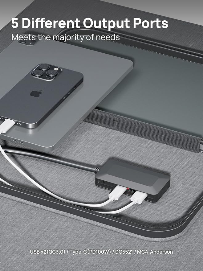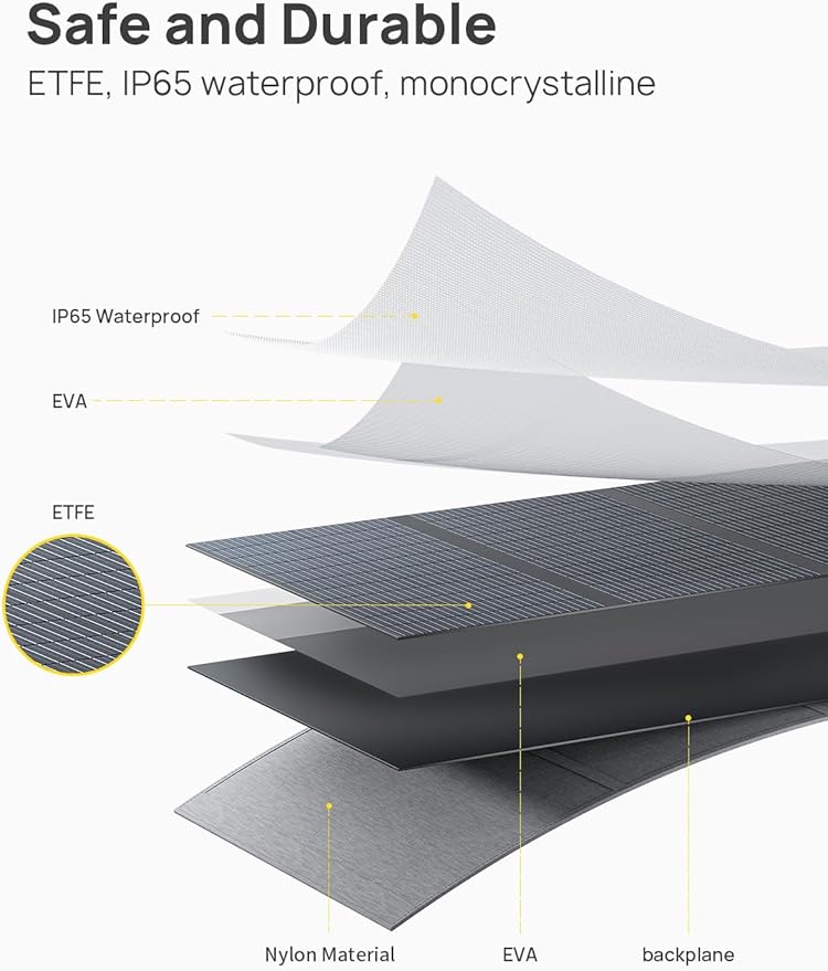 - 【High-Performance Solar Panel】It adopts industrial-grade monocrystalline silicon with a maximum sunlight conversion efficiency of 23%. The ETFE high-transparency encapsulation film has excellent light transmittance, is wear-resistant and lightweight, and the overall weight is only 9.9 pounds.
