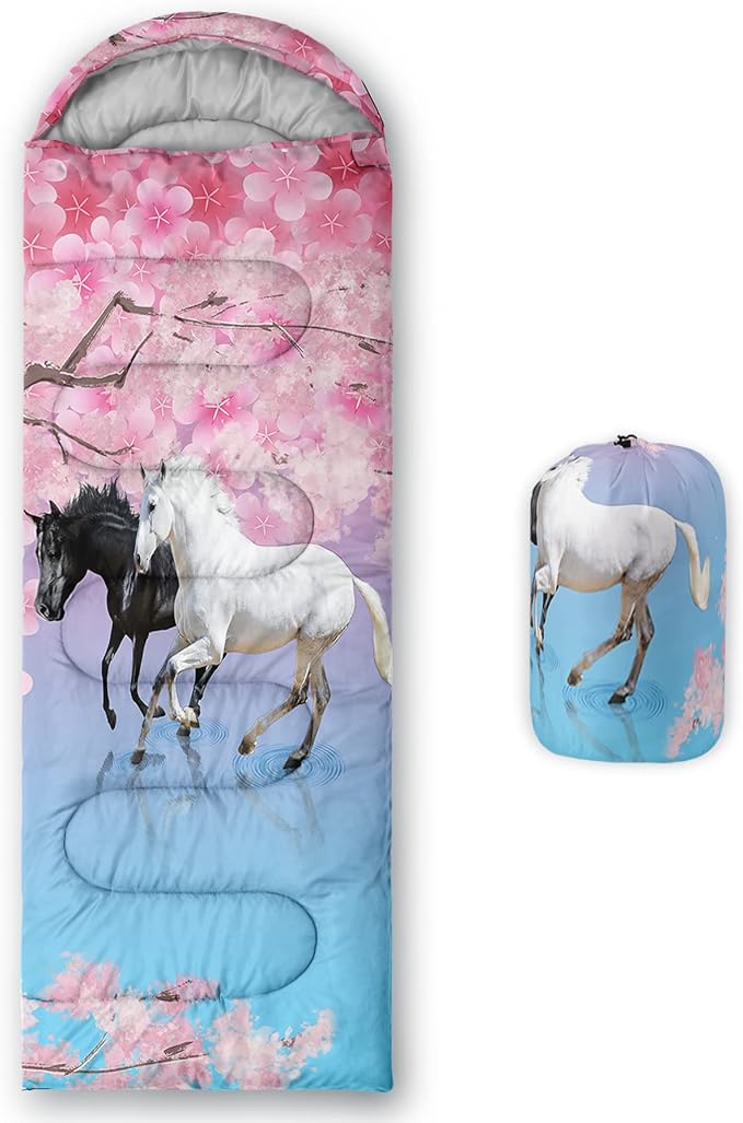 - 【Fits For 3 Seasons】: Size - 31 by 90 inches (W x D). Our Pink cherry blossoms sleeping bag can be used in 3 seasons with a design temperature of 32℉-77℉(0℃-25℃). These 3D Horse bags also have a weather resistant waterproof design to keep you warm and prevent you from any dampness.
