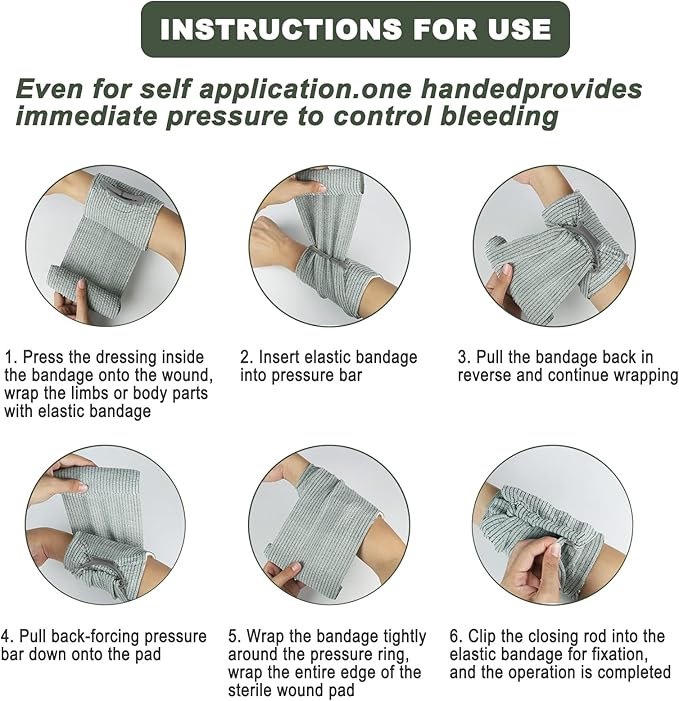 - MULTIFUNCTIONAL FIRST AID DEVICE: The Israeli compression bandage can be applied to multiple parts of the body including arms, legs, torso, head, and anywhere else. It can even be used as rings, splints, and a simple tourniquet in an emergency. This pressure-integrated device is equivalent to a small emergency system and is widely used by the military, first responders, EMS, law enforcement, commercial and industrial sites.