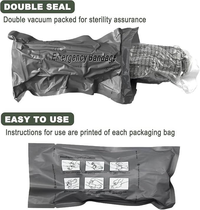 - STERILITY GUARANTEED: This approved device for first aid applications is individually vacuum sealed to guarantee sterility and safety. The compact and portable package is easy to safely store in a backpack, first aid kit, medic trauma bag, car, and more. Materials include chitosan fiber, calcium alginate fiber, polyurethane functional film, self-adhesive elastic bandage, and absorbent cotton.