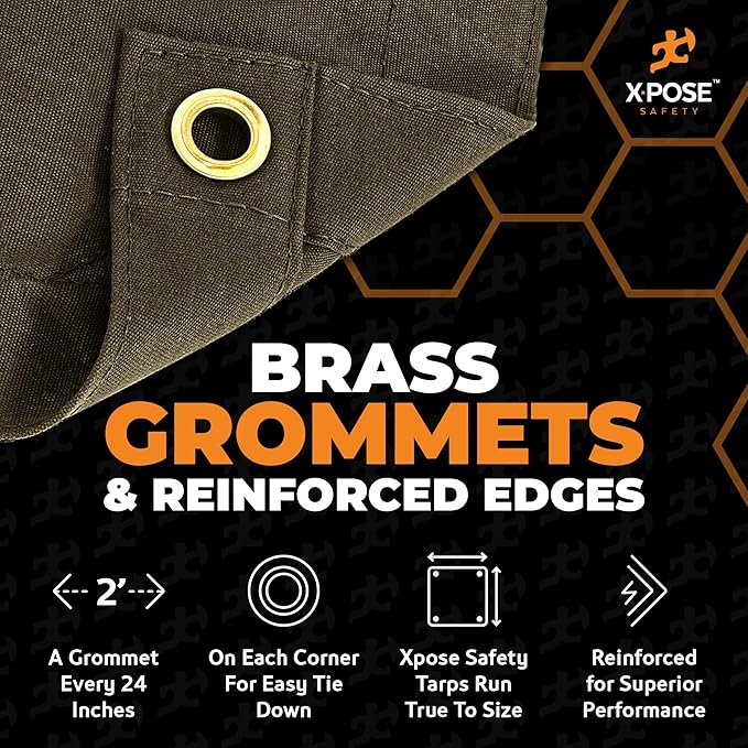 - REINFORCED BRASS GROMMETS - This water-resistant tarp is engineered with brass grommets at all 4 corners and every 24 inches along the double-stitched outer seam, with triangle reinforcement in each grommet delivering powerful rip-stop tear resistance and tie-down ability in harsh weather conditions.