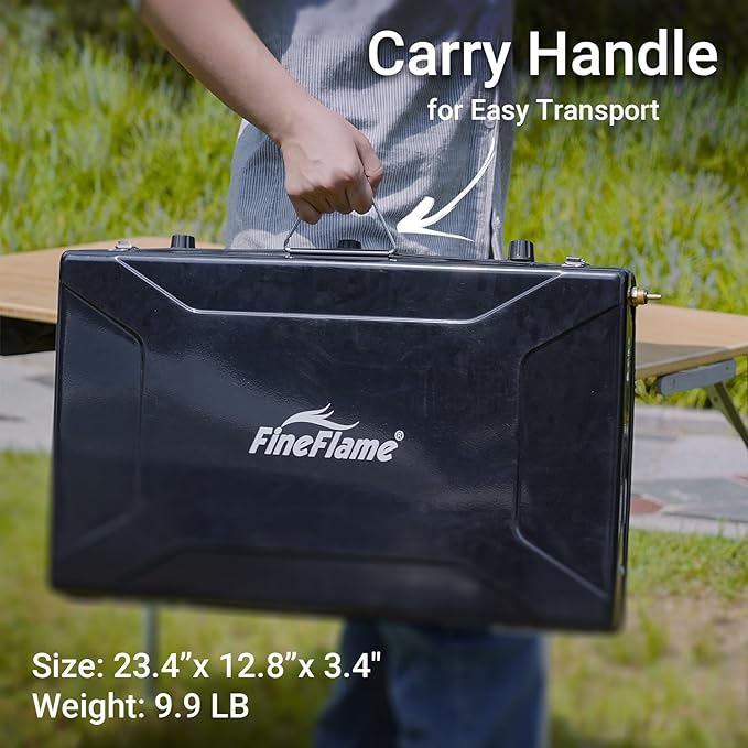- PORTABLE: This 3-burner portable camping stove comes with a built-in carrying handle that allows you to carry it conveniently. It has a compact structure and weights only 10lbs which makes it even easier to carry it around. It can be taken along in a luggage or storage box, or even large tote bag, so carrying this portable propane camping stove is a breeze thing to do! Size: 23.4”x12.8”x3.4", Weight:10 LB