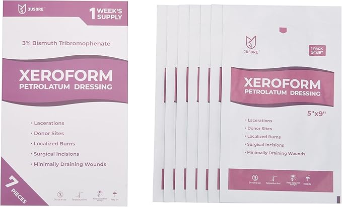 - MEDICAL XEROFORM PETROLATUM DRESSING GAUZE: This xeroform petrolatum dressing 5x9 is made of a fine, soft, compliant mesh gauze enriched with petroleum jelly oil and 3% bismuth tribromophenate. This formula is the perfect combination of ingredients to protect the skin while promoting healing and adhering to the various contours of the body