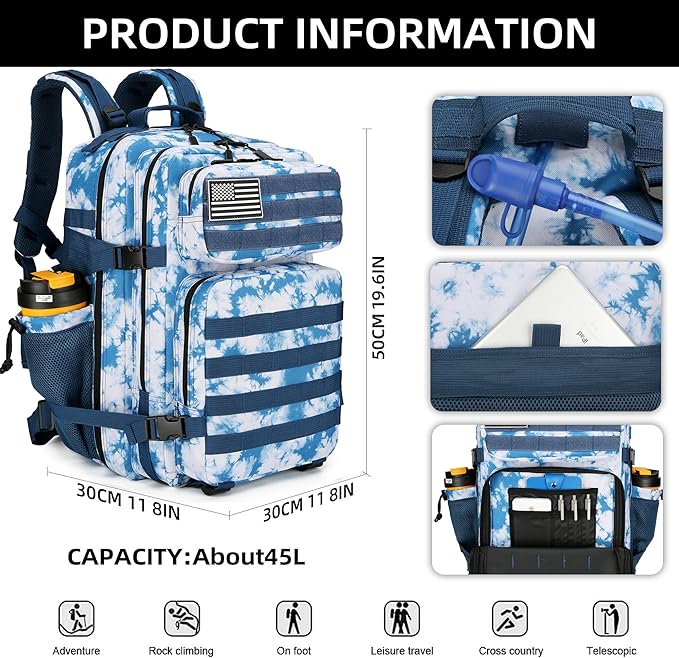 - SUPERIOR DURABILITY- Each backpack measures 22 x 10 x 14 inches, 45 Liter Tactical Assault Backpack is made of high quality 900D Oxford fabric, super durable for daily use or outdoor adventure.