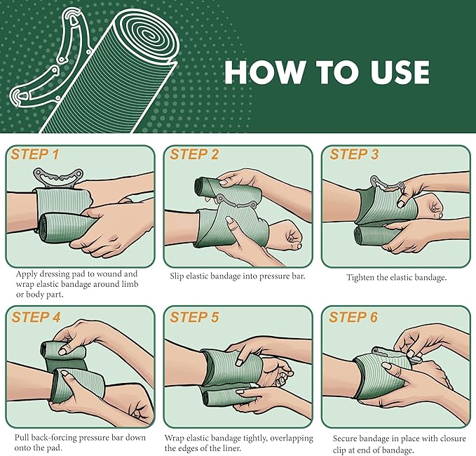 - ALL-IN-ONE MULTIFUNCTIONAL DESIGN - Combines an elastic assist bandage, non-adhesive pad, Pressure Applicator, and closure in one unit. Simplifies the first aid process and enables quick and effective response to a wide range of wounds.