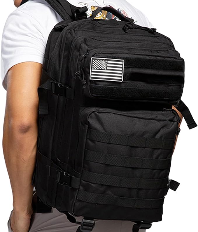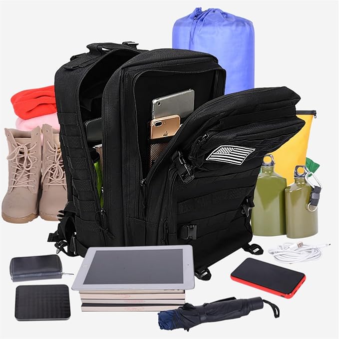 - Large Capacity & Organized Storage - 45l black military backpack with 180° clamshell opening,17-inch padded laptop sleeve and 5 compartments (2 front pockets,2 main compartments,mesh pocket). Perfect for 3-day trips,gym gear or emergency supplies,size 19.7in x 11.8in x 11.8in