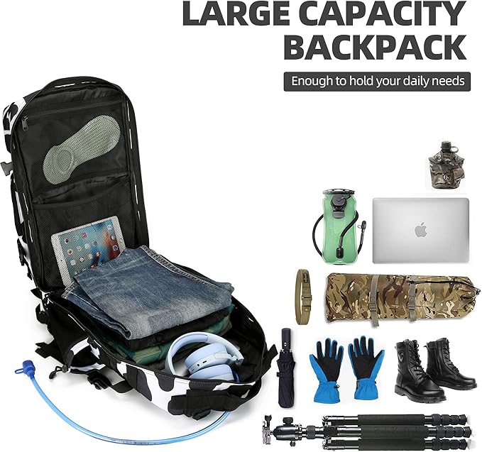 - MULTIFUNCTIONAL COMPARTMENT- With a spacious main compartment, multiple front and side pockets, and a separate laptop sleeve, this tactical backpack can hold a wide range of gear, from clothing to electronics, for a three-day assault mission or other outdoor activities.