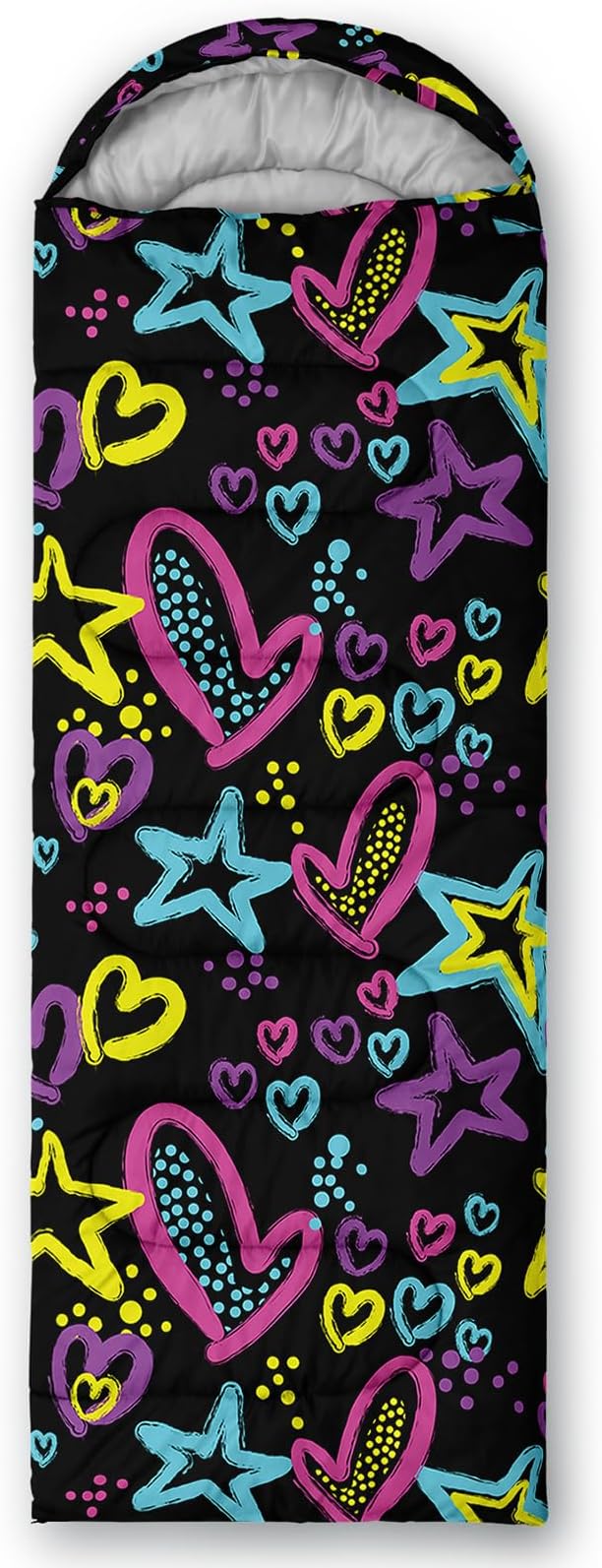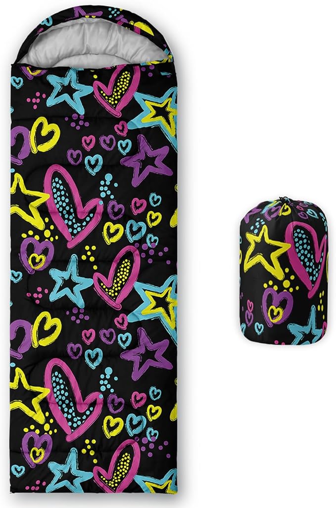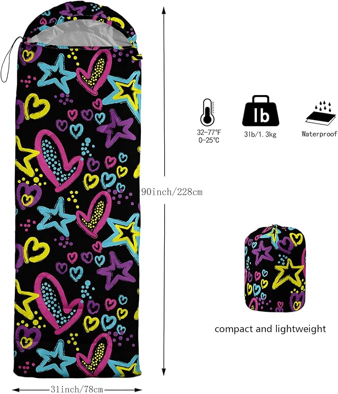 - 【Fits For 3 Seasons】: Size - 31 by 90 inches (W x D). Our Colorful Love sleeping bag can be used in 3 seasons with a design temperature of 32℉-77℉(0℃-25℃). These Cartoon bags also have a weather resistant waterproof design to keep you warm and prevent you from any dampness.