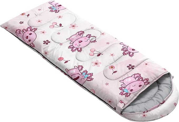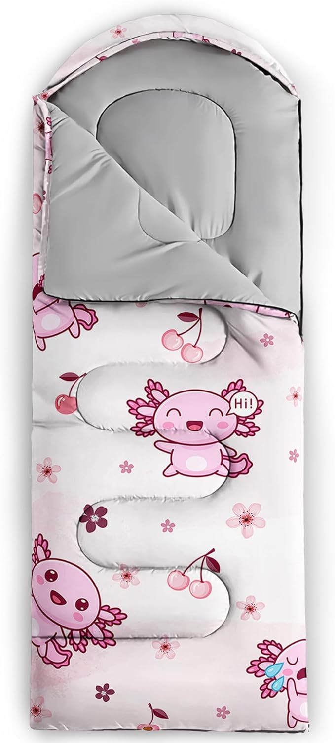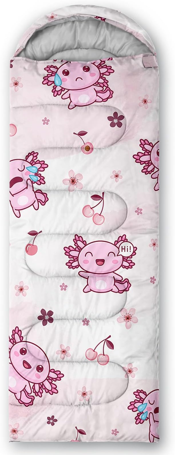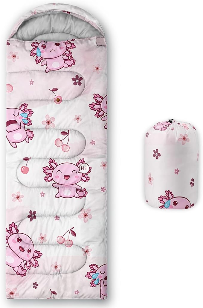 - 【Fits For 3 Seasons】: Size - 31 by 90 inches (W x D). Our Axolotl Cherry sleeping bag can be used in 3 seasons with a design temperature of 32℉-77℉(0℃-25℃). These Sleeping bags also have a weather resistant waterproof design to keep you warm and prevent you from any dampness.