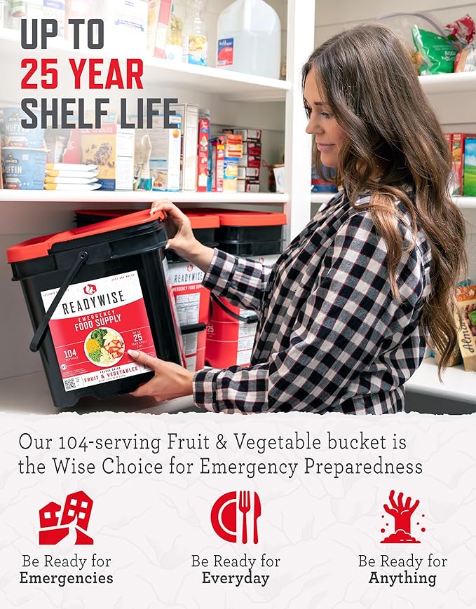 ReadyWise Emergency Food Supply - 104 Servings Freeze Dried Fruit and Vegetables Bucket, Protein Meals, Camping Essentials for Survival Food, Disaster Prepping Supplies, up to 25 Year Shelf Life