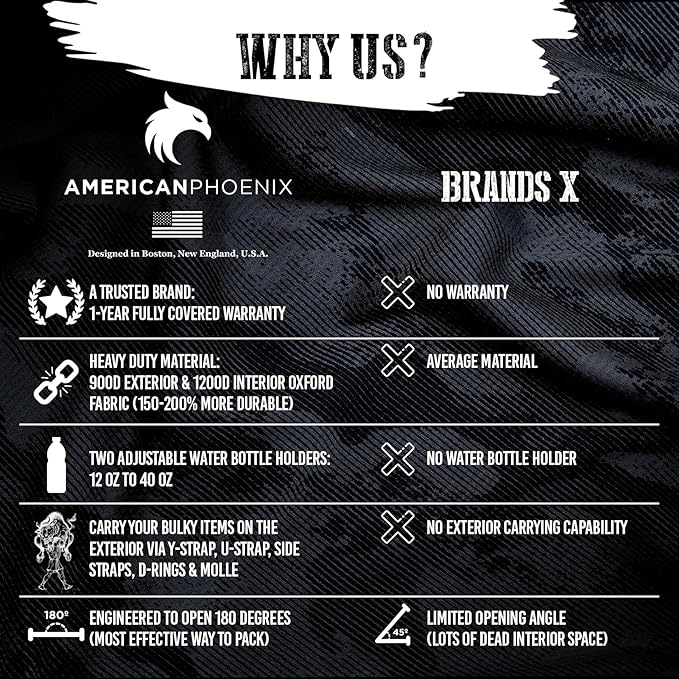 - π¦ TACTICAL EFFICIENCY: The AMERICANPHOENIX backpack is a fusion of military and lifestyle. With cushioned shoulder straps, ventilated back panel, and an adaptive volumetric design, it is well suited as both an everyday carry (EDC) and a robust hiking backpack.