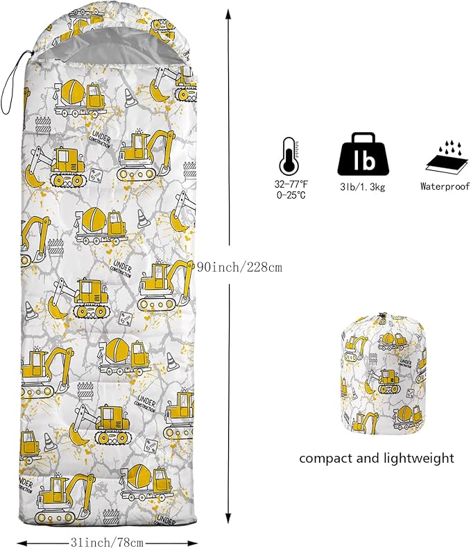 - 【Fits For 3 Seasons】: Size - 31 by 90 inches (W x D). Our Excavator Trucks sleeping bag can be used in 3 seasons with a design temperature of 32℉-77℉(0℃-25℃). These Sleeping bags also have a weather resistant waterproof design to keep you warm and prevent you from any dampness.