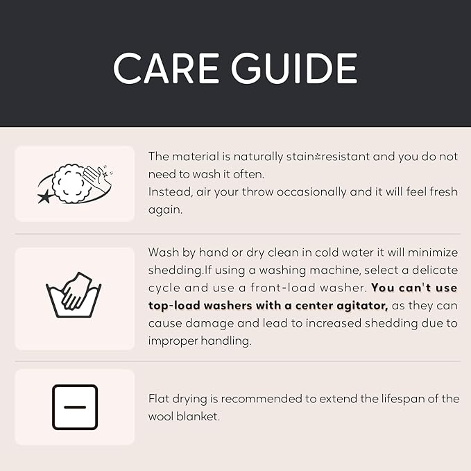 - EASY MAINTENANCE-Thanks to wool blanket, it has self-cleaning function, so it is usually washed once every one or two years.Instead, air your throw occasionally and it will feel fresh again. A little shedding is normal during the first wash, but if you can wash by hand or dry clean in cold water it will minimize shedding. In this way, the wool blanket can be protected and the service life of the wool blanket can be extended, and it may also accompany your life directly.If using a washing machine, select a delicate cycle and use a front-load washer. You can't use the top-load washers with a center agitator, as they can cause damage and lead to increased shedding due to improper handling.