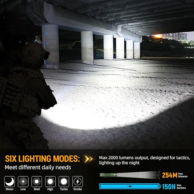 - 【Six Brightness Modes】Multi-purpose use - From 10 lumens in ECO mode to 2,000 lumens in Turbo mode, it's the first choice for your daily on-the-go lighting, whether you're on the job or taking a weekend break from work, and it's a versatile, powerful flashlight rechargeable for a wide range of applications.