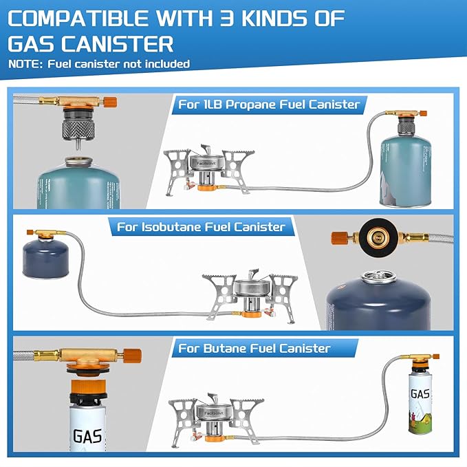 - Versatile Gas Compatibility: Includes adapters for butane and 1LB propane tanks, making it compatible with butane, butane-propane hybrid tanks (EN 417), and standard propane canisters. Perfect for any outdoor adventure!