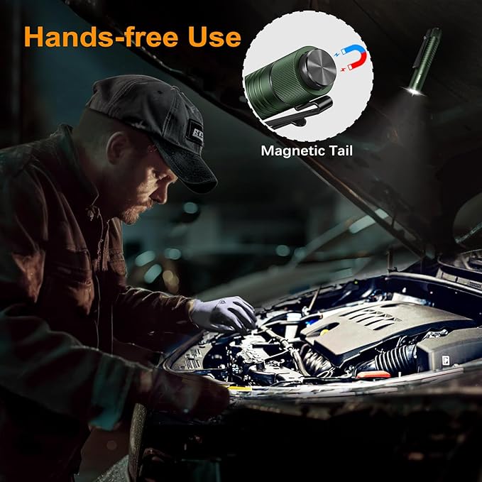 - Hands-free Use:Enhanced dual-direction pocket clip making it easy to be cliped onto a hat brim, so you can use it as a bright headlamp. The tail magnetic function makes you to free your hands in various usage scenarios such as repair, operation, warehouse, etc