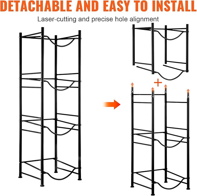 - Multi-Tier Storage: This 4-tier water jug holder measures 13 x 13 x 41.2 in. Its vertical design holds up to 4 bottles and supports up to 167.6 lbs. It saves space by stacking bottles neatly in a corner. Its simple industrial design complements various interior styles, making it ideal for any space!