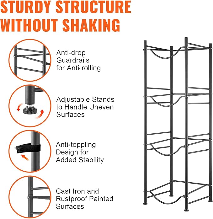 - Thoughtful Design: Our water jug holder features high guardrails to prevent taller buckets from falling and shelf grooves to keep bottles securely in place. The four adjustable feet protect floors from scratches and ensure stability on uneven surfaces. An anti-tip feature allows the rack to be mounted to the wall for extra stability. Handles make lifting and placing bottles easier and more convenient.