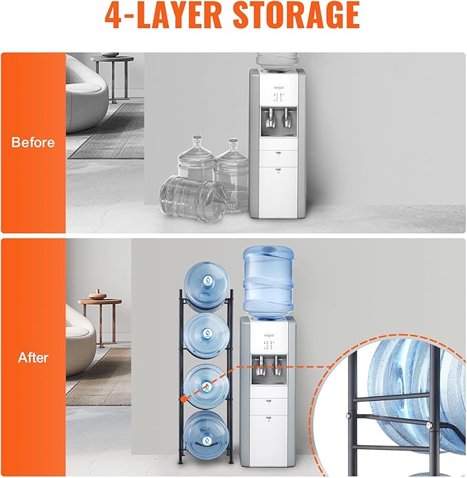 - Versatile Use: The water jug stand is ideal for living rooms, storage rooms, kitchens, garages, food pantries, closets, laundry rooms, gyms, and offices. This rack helps you organize and maximize space efficiently.