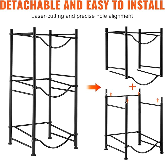 - Multi-Tier Storage: This 3-tier water jug holder measures 13 x 13 x 29 in. Its vertical design holds up to 3 bottles and supports up to 125.7 lbs. It saves space by stacking buckets neatly in a corner. Its simple industrial design complements various interior styles, making it ideal for any space!