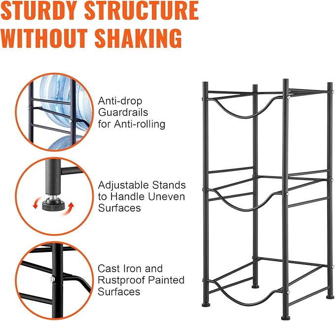VEVOR 5 Gallon Water Jug Holder, 3 Tiers Water Bottle Holder, Heavy Duty Water Bottle Rack with 3 Slots, Detachable Water Jug Stand for Kitchen, Office, Living Room- Black