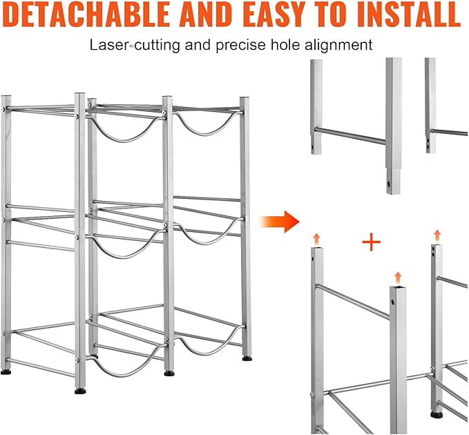 - Thoughtful Design: The water gallon holder includes high guardrails to prevent taller buckets from falling, shelf grooves to keep bottles secure, and adjustable feet to protect floors and stabilize the rack on uneven surfaces. Handles make bottles placement easy.