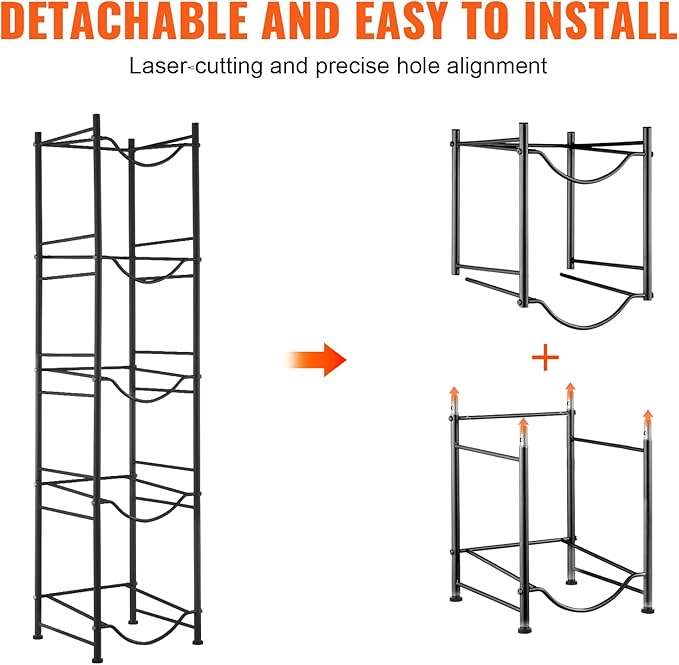 - Multi-Tier Storage: This 5-tier water jug holder measures 13 x 13 x 53.3 in. Its vertical design holds up to 5 bottles and supports up to 209.4 lbs. It saves space by stacking bottles neatly in a corner. Its simple industrial design complements various interior styles, making it ideal for any space!