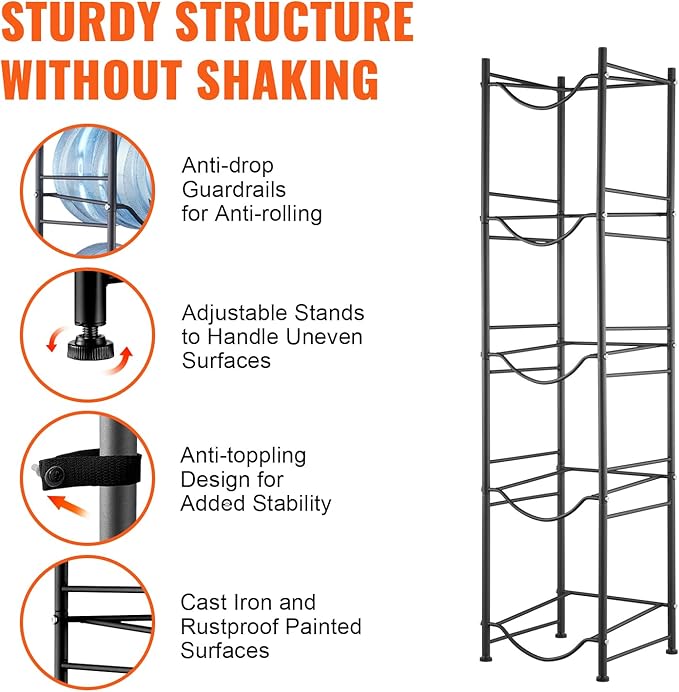 VEVOR 5 Tiers Water Jug Holder, 5 Gallon Water Bottle Holder, Single Row Water Bottle Rack for 5 Bottles, Heavy Duty Water Jug Rack for Kitchen, Office, Living Room, Black